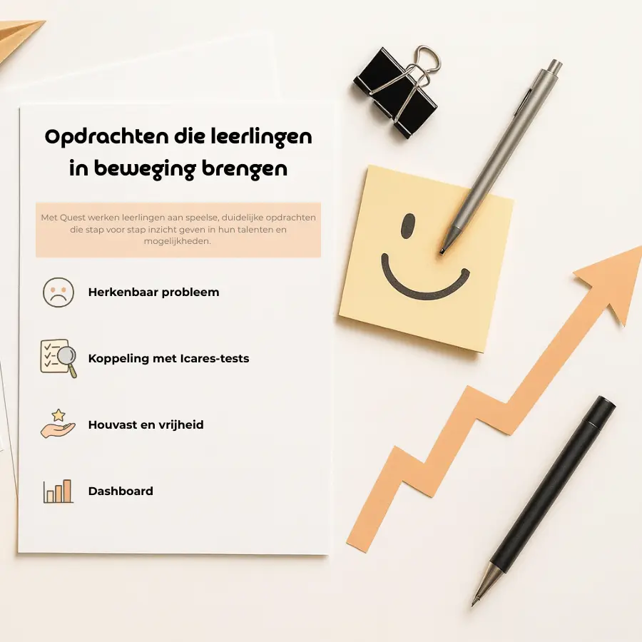 Veel scholen herkennen het probleem: leerlingen maken hun opdrachten niet of alleen omdat het moet. Voor leerlingen voelt studiekeuze vaak nog niet als iets noodzakelijks. Quest maakt opdrachten kort, speels en herkenbaar, zodat leerlingen wél in beweging komen.