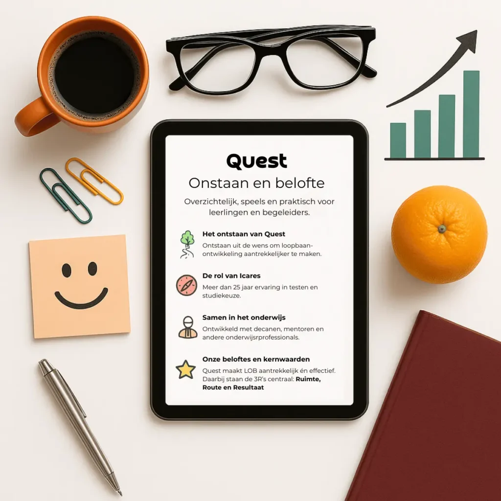Met Icares Quest bouwen we voort op deze expertise, specifiek gericht op leerlingen en decanen in het voortgezet onderwijs. Het platform ondersteunt bij de verplichte LOB-activiteiten en is ontwikkeld in samenwerking met onderwijsprofessionals. Door de combinatie van inhoudelijke diepgang, herkenbare opdrachten en gebruiksvriendelijkheid, sluit Quest optimaal aan op de praktijk.